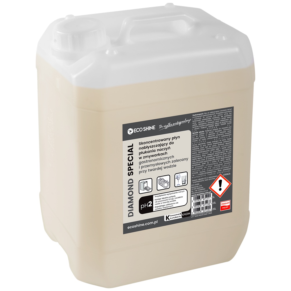 Diamond Special to wysokowydajny, skoncentrowany płyn nabłyszczający przeznaczony do profesjonalnych zmywarek gastronomicznych i przemysłowych. Został opracowany specjalnie z myślą o trudnych warunkach pracy, w tym przede wszystkim o użytkowaniu w obszarach z twardą wodą, gdzie osady wapienne są dużym problemem. Dzięki innowacyjnej formule preparat doskonale radzi sobie z przyspieszaniem schnięcia naczyń, nadając im lustrzany połysk bez smug i zacieków.